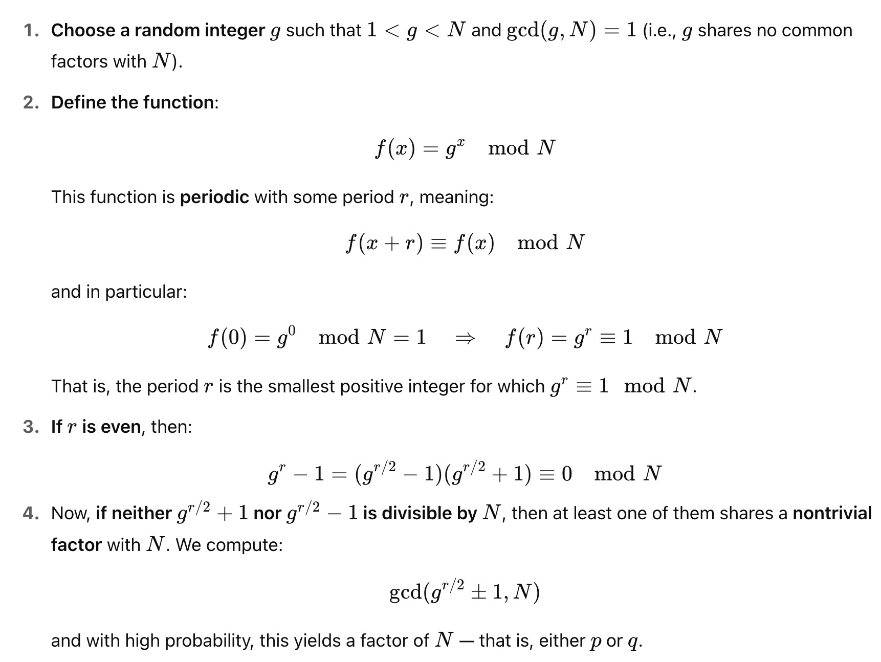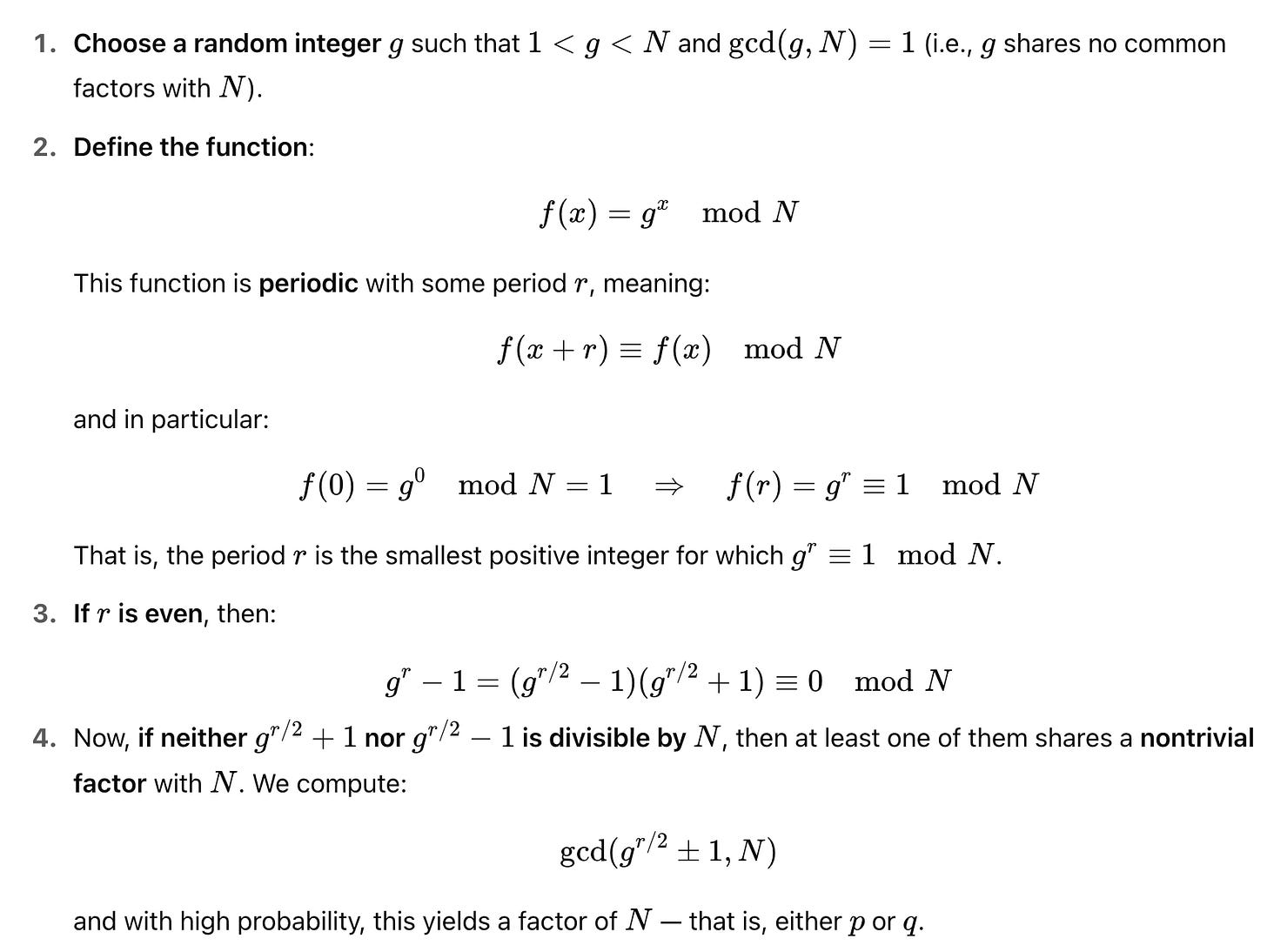 Here is how Shor’s algorithm gets around this problem. Suppose we are trying to factorize a product of two large primes N=pq (and thereby crack RSA). We can do the following: